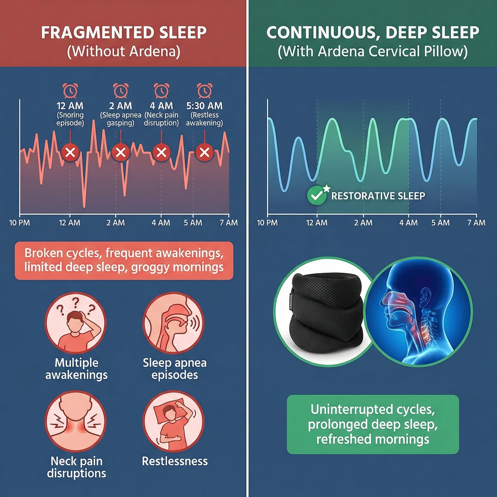 Ardena Cervical Support Pillows are the first engineered to restore what poor sleep breaks: proper airway alignment, spinal support, muscle relaxation, and restorative rest.